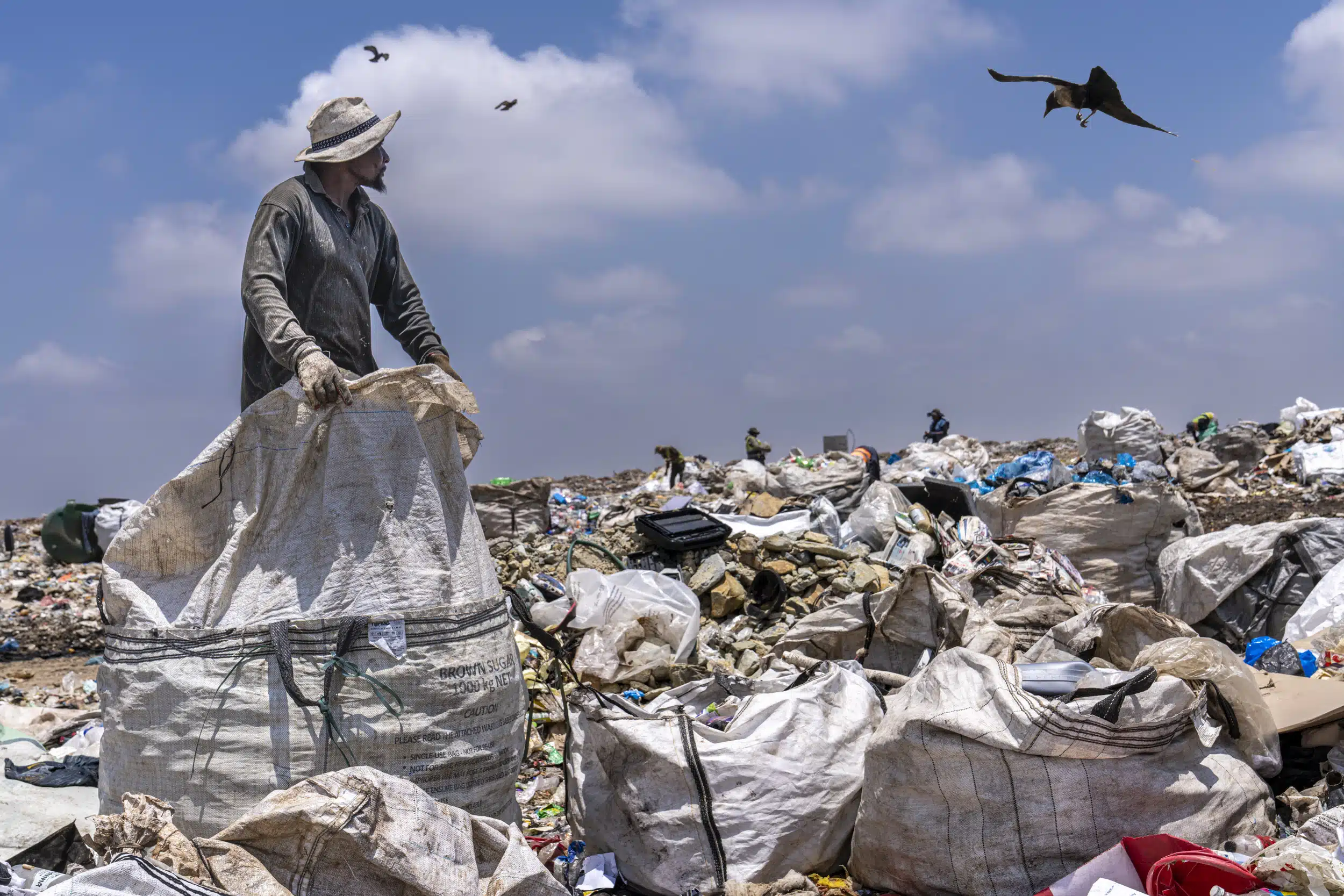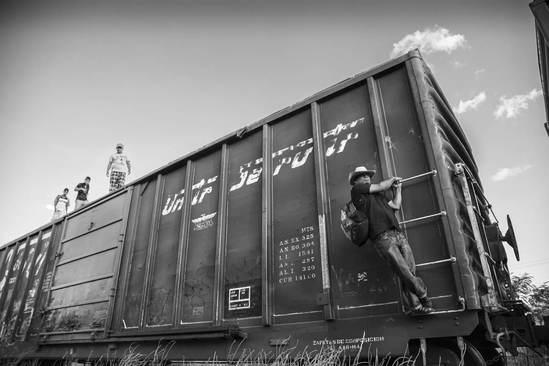 Migrants catch a ride on the side and top of the train cars.
