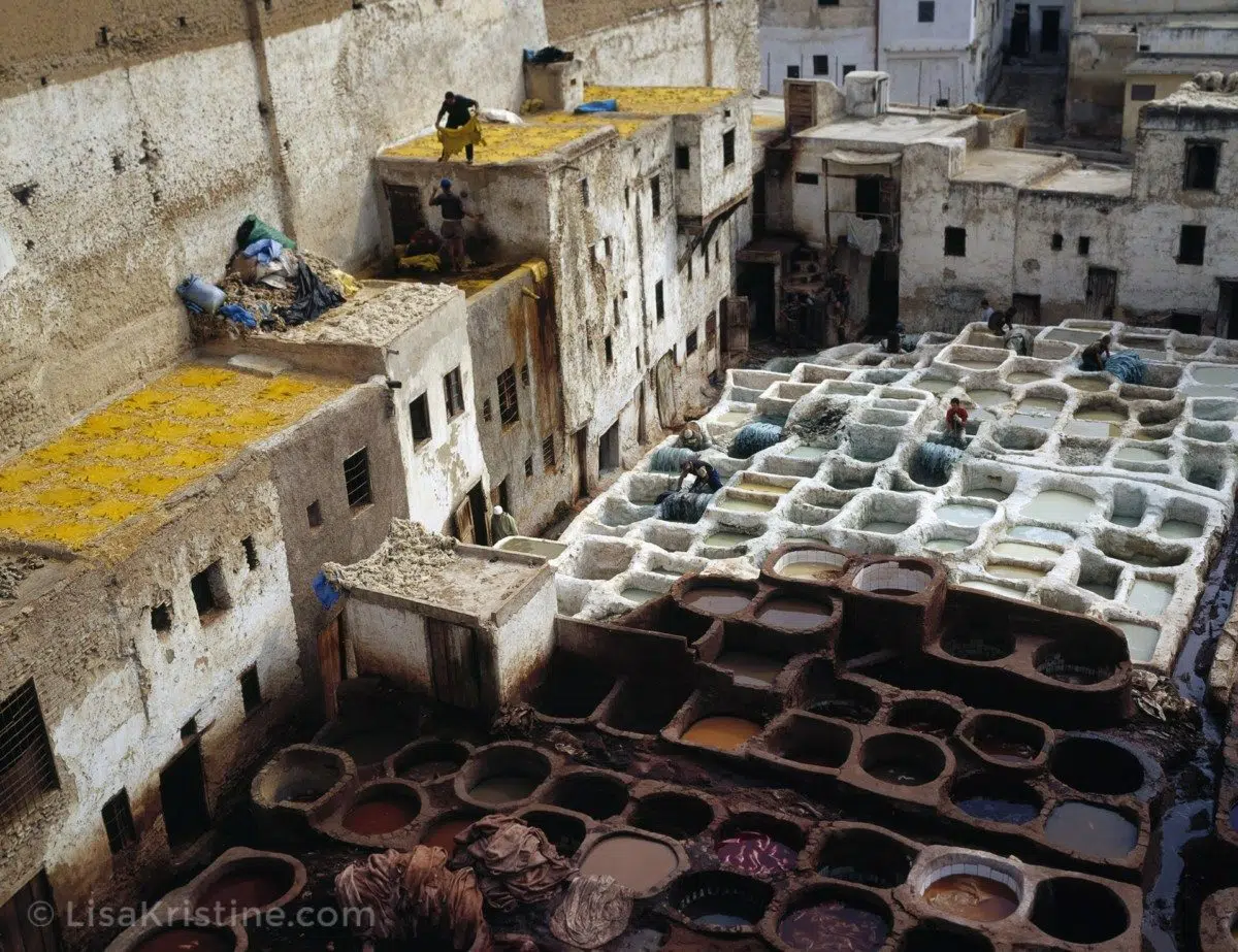 Tanning is one of the world’s oldest traditional arts, dating back more than 7,000 years. Located near watercourses and often some length from residential quarters due to the strong stench of animal skin, tanneries turn the hides of goats, sheep, cows, and camel into soft, rot-proof leather. The hides undergo a series of processes including hair removal, soaking, drying and rinsing before being handed over to the leather workers. Some of the ingredients of this odorous process include pigeon excrement, cow urine, fish oils, animal fats and brains, chromium salts, and sulfuric acids. Morocco continues to thrive in the medieval tradition of leather tanning. Skins are still hauled by donkey to the souq and the tanning and dying vats continue to be constructed from mud brick and tile. Health and safety precautions for the workers in the pits have changed little over the centuries and the tanneries are structured according to the medieval guild principles. The Fassi leather, made in the Wadi Fes, has for centuries been considered among the finest in the world.